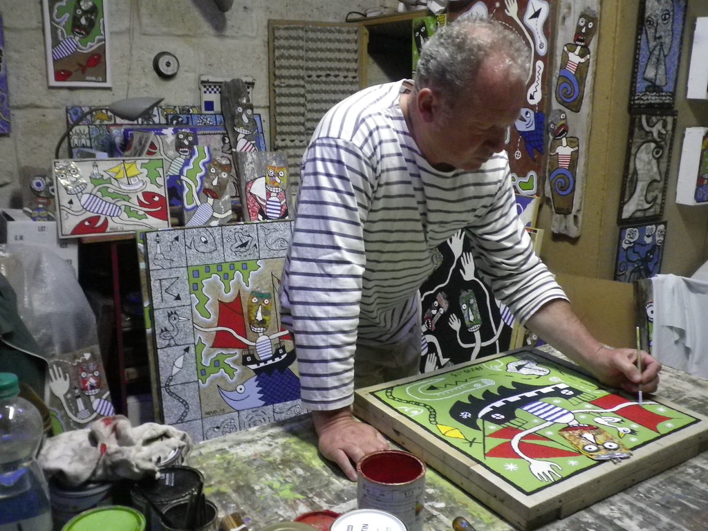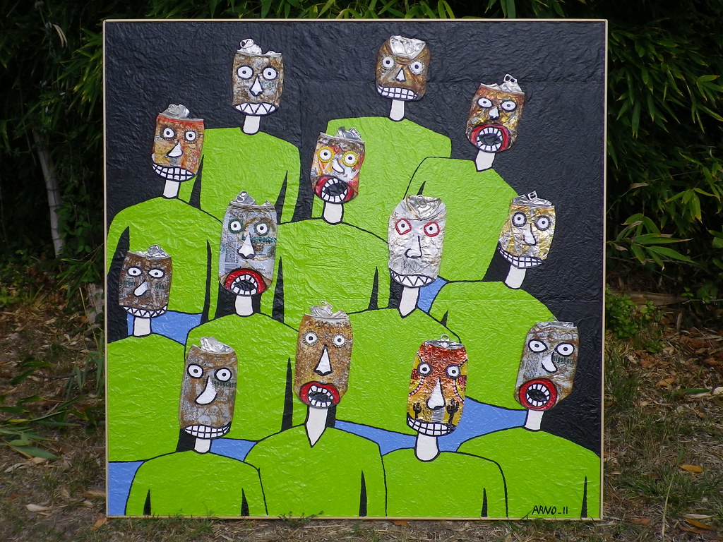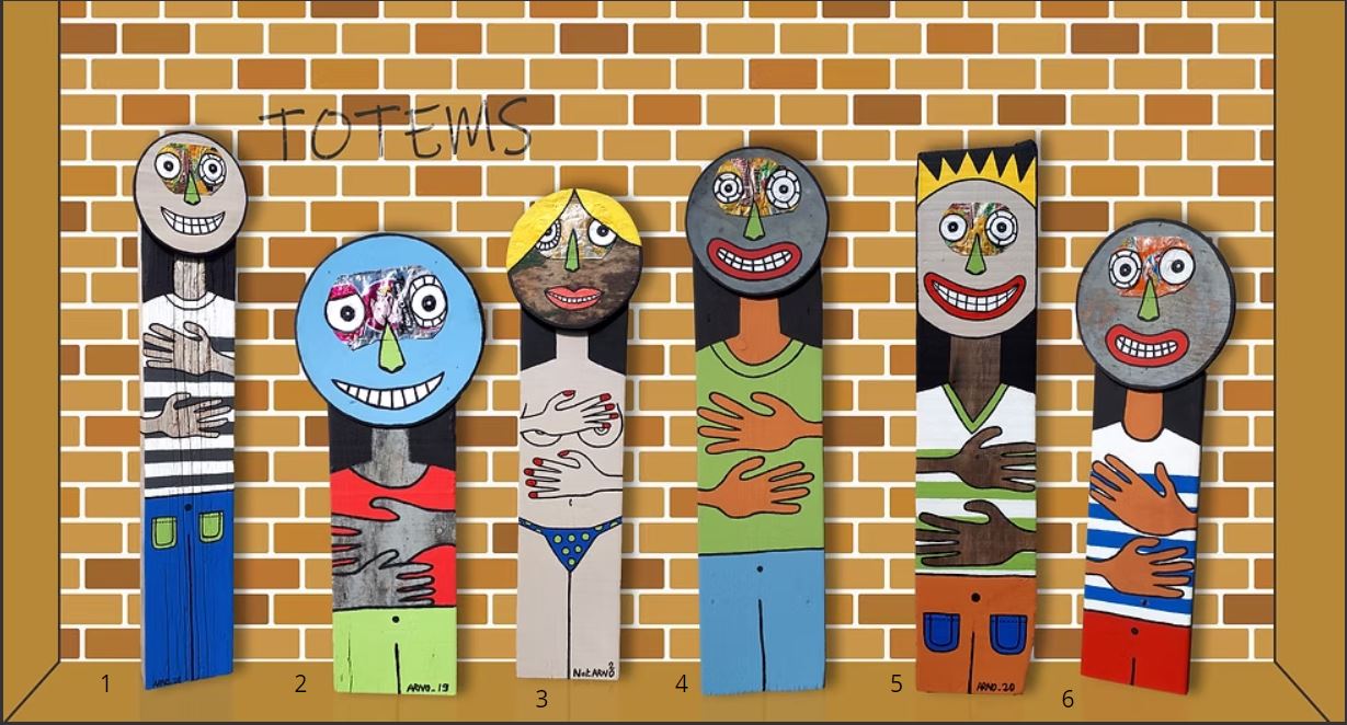 Né en 1966, fils de marinier et lui-même navigateur, les aventures picturales d’Arno sont imprégnées d’une culture maritime et d’un humour poétique. Ses premières peintures dates de 1988 et depuis quelques années, sa démarche s’organise autour de rencontres. Rencontres avec des canettes métalliques écrasées, malmenées, stigmatisées : il les assimile à des naufragés. Autour d’eux, des cartographies maritimes imaginaires et des créatures hybrides apparaissent suivant son inspiration. Ses peintures sont réalisées en grande partie sur des bois flottés, eux aussi naufragés de la mer…