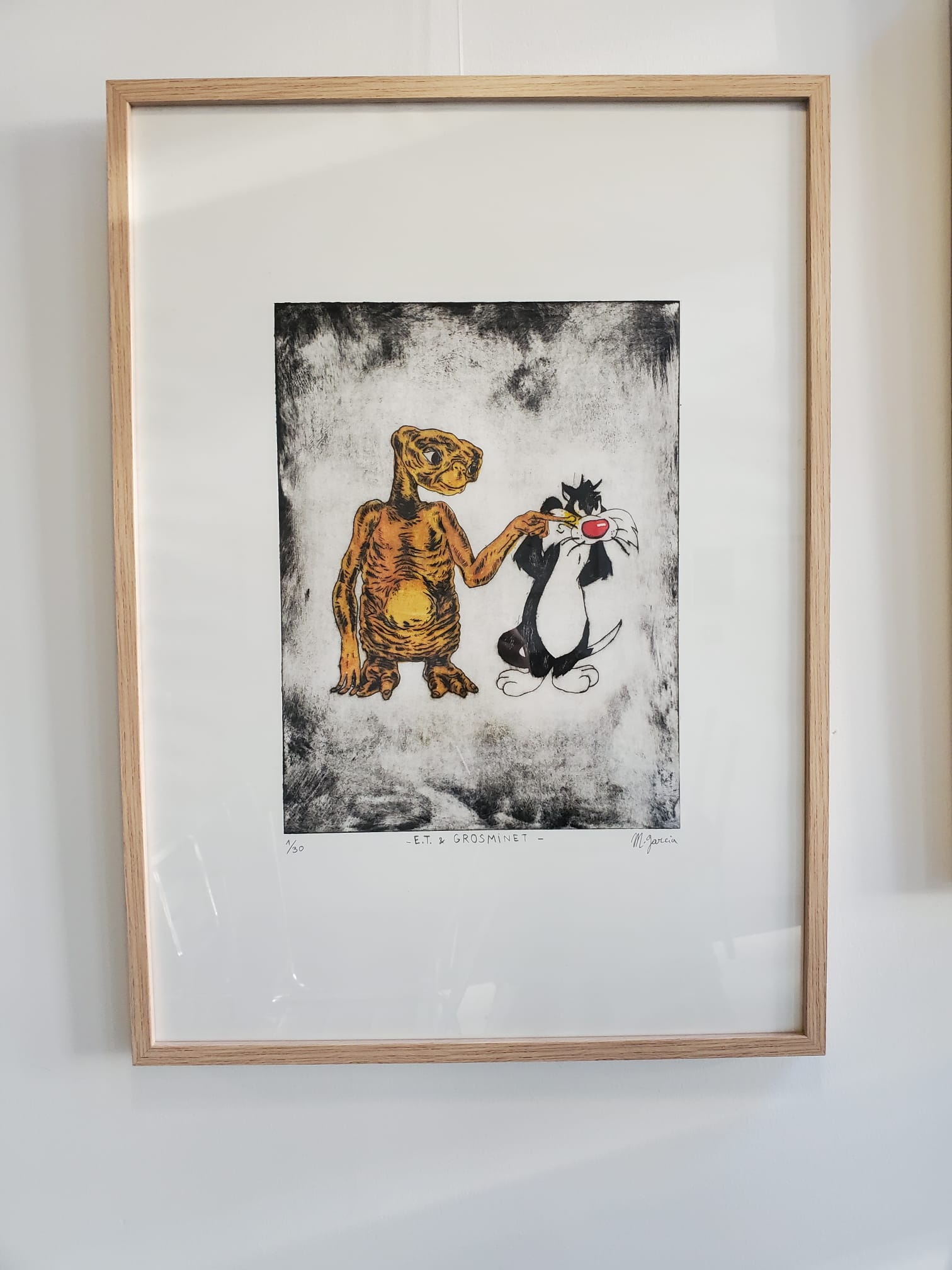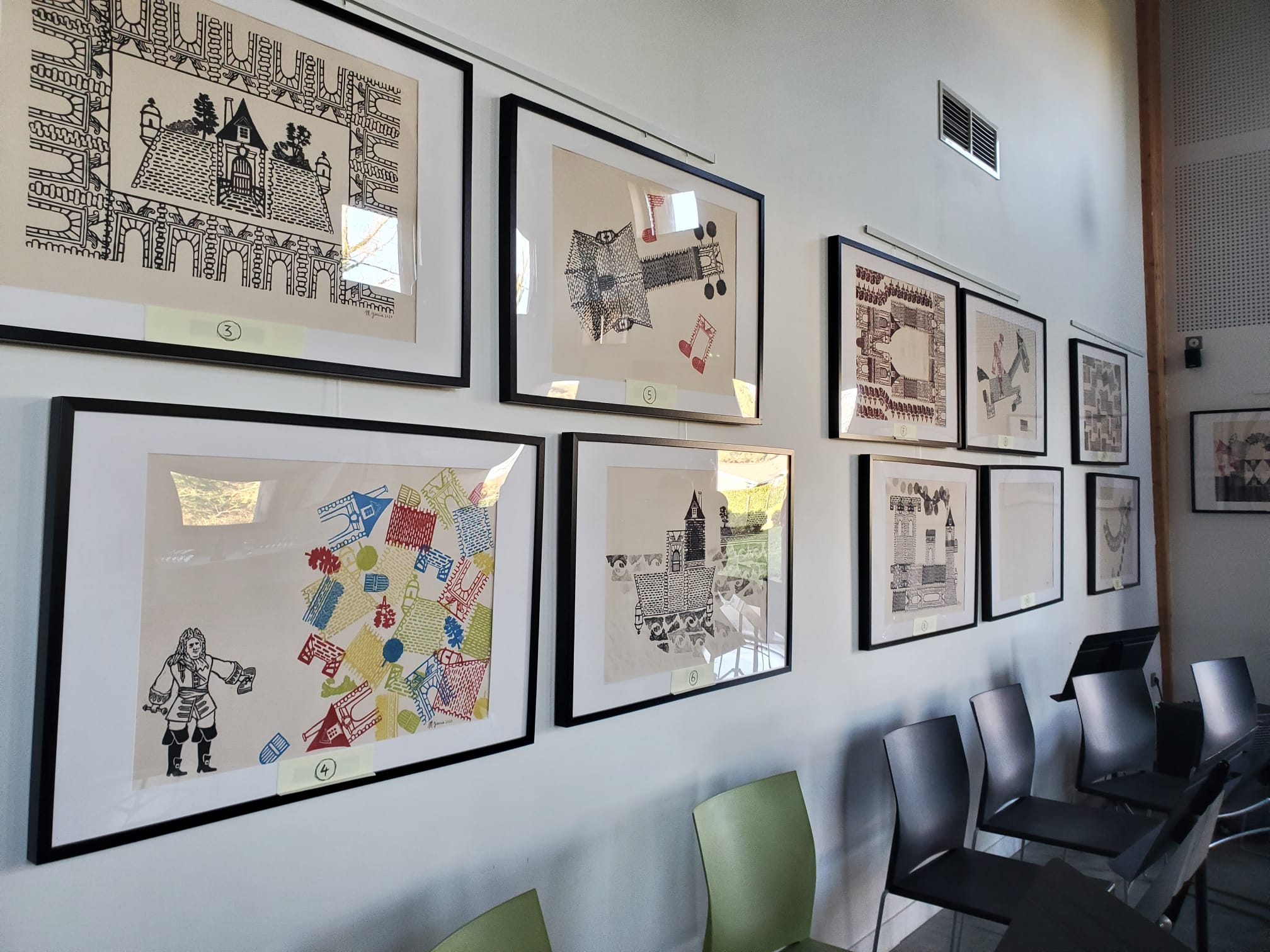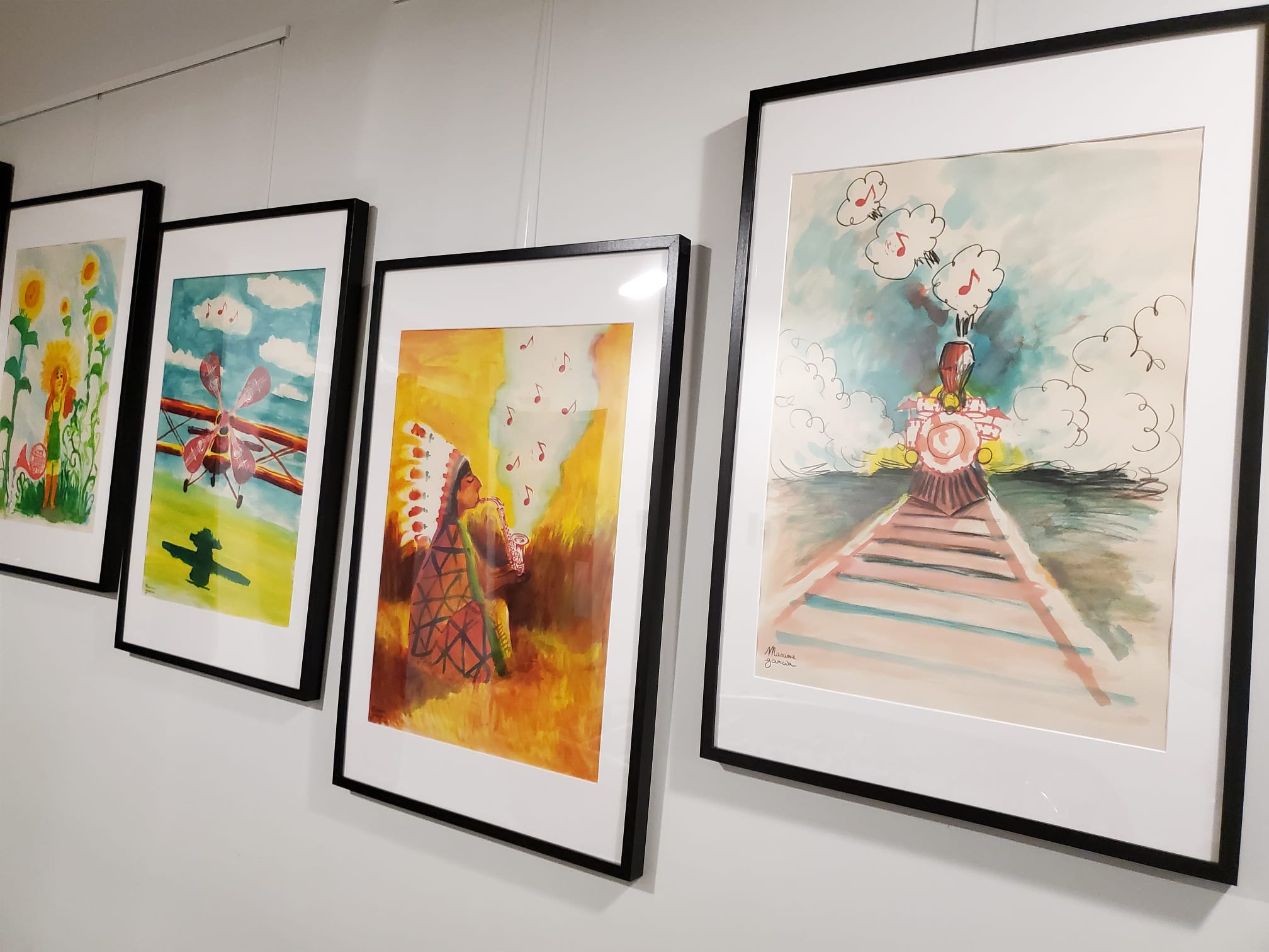 - des dessins aux crayons de couleurs, gravées à la pointe sèche, et colorées à l’encre « Merci les enfants »
