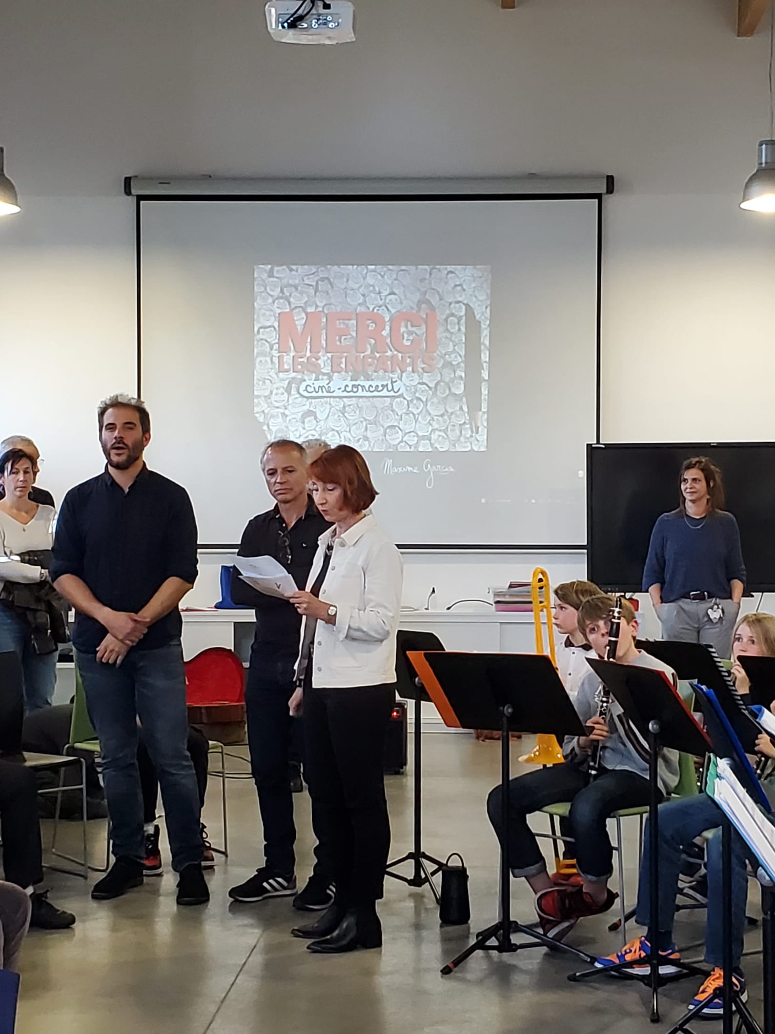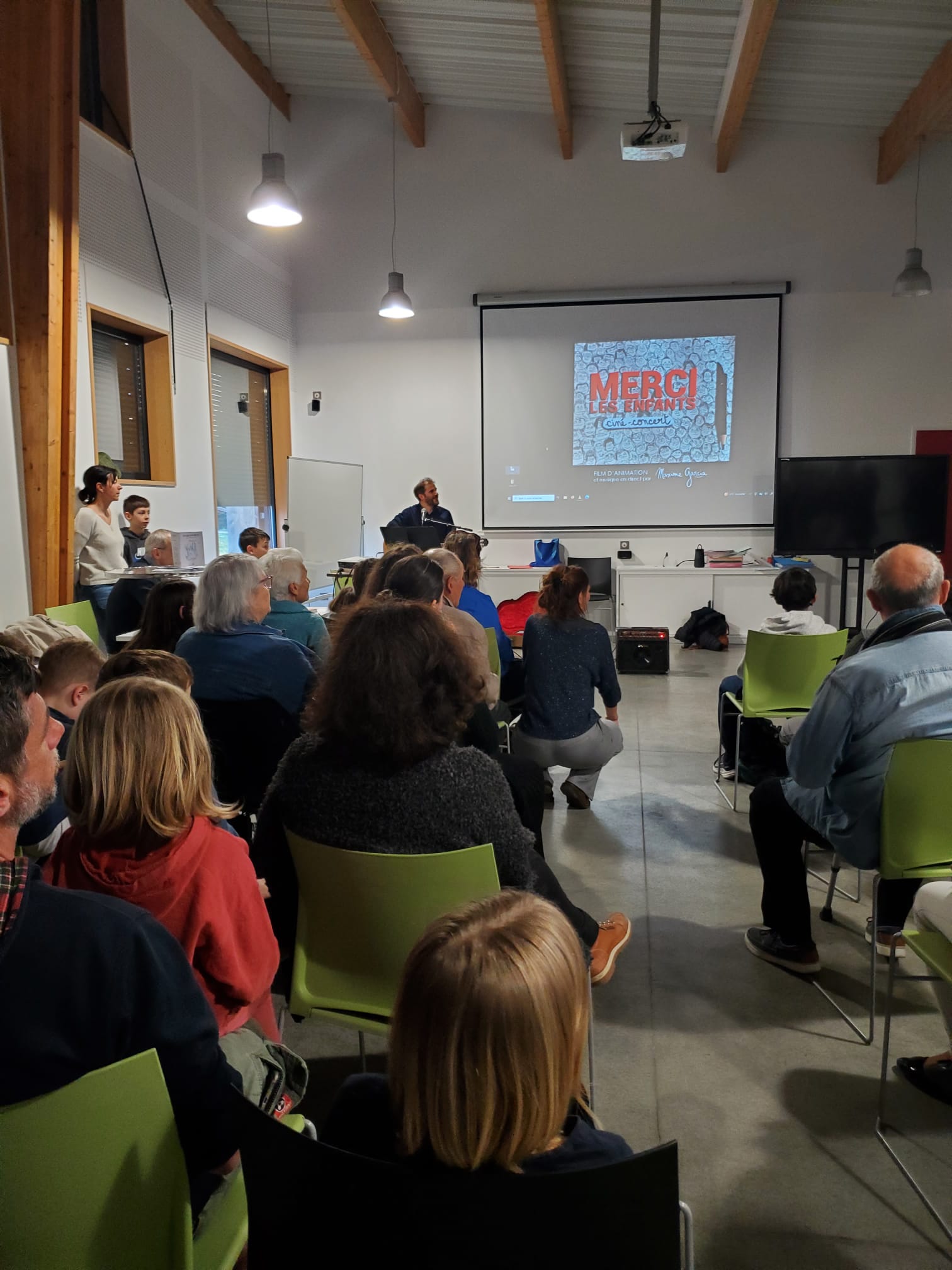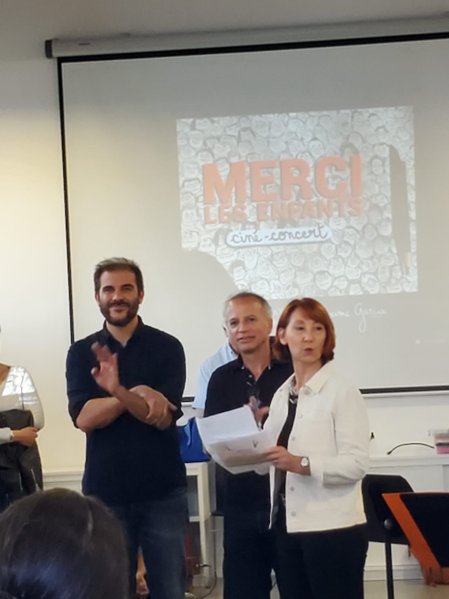 - des dessins aux crayons de couleurs, gravées à la pointe sèche, et colorées à l’encre « Merci les enfants »
