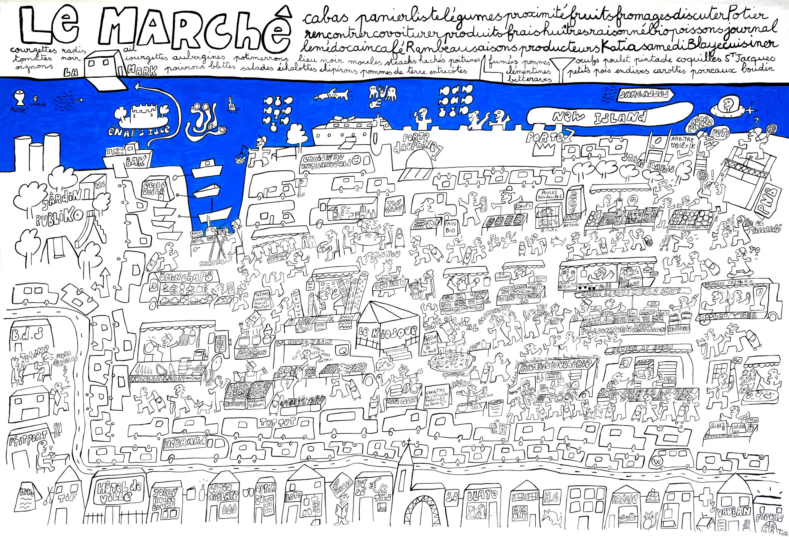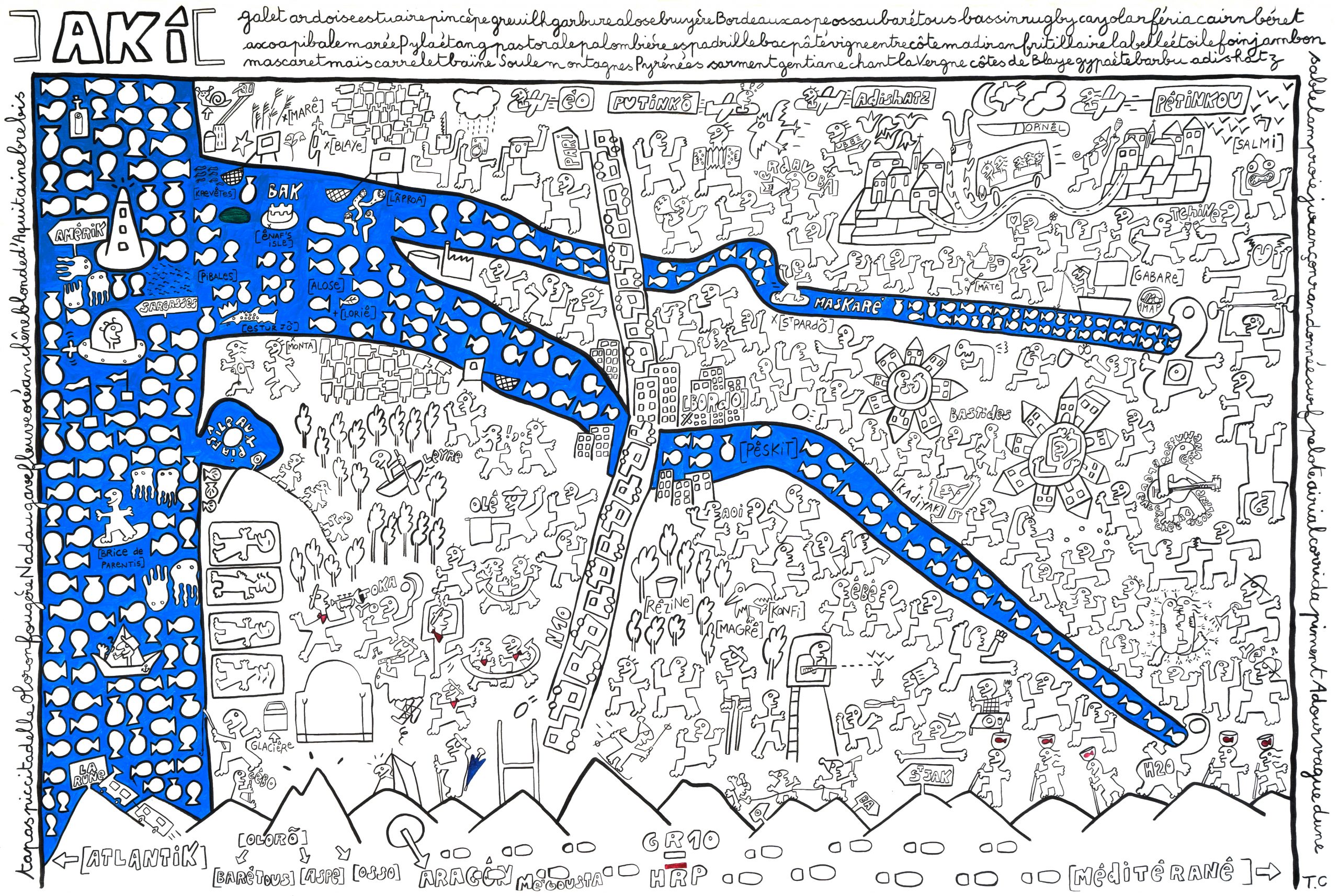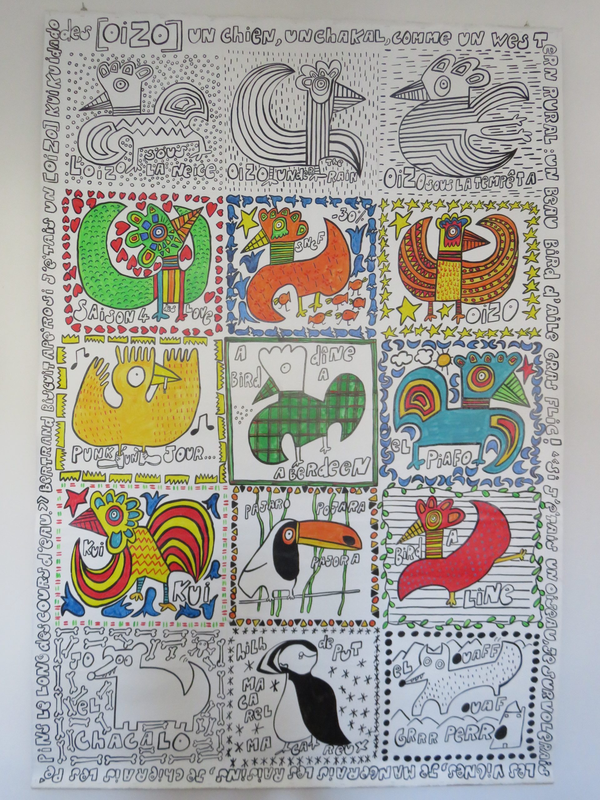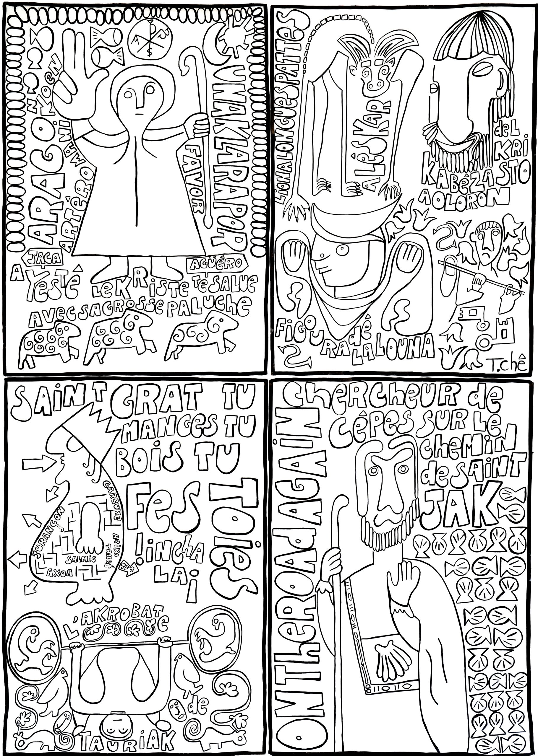 Autodidacte sans diktat, né en 1961, 3 enfants, il se définit comme instituteur/plouk/fabrikateur de [tablo] et [fotografeur]. Des séries, des personnages imbriqués, des mots, un questionnement graphique parfois poétique, humoristique, loufoque, automatique… Une recherche sur l’identité, des petits fragments de vie reconstitués, des souvenirs, des aspirations, des moments de bonheur tracés sur des rectangles de papier collés sur du carton ondulé ([tablo] porte-[manto]) ou sur des toiles XXL. Un travail comme un carnet de voyage de proximité, spontané.